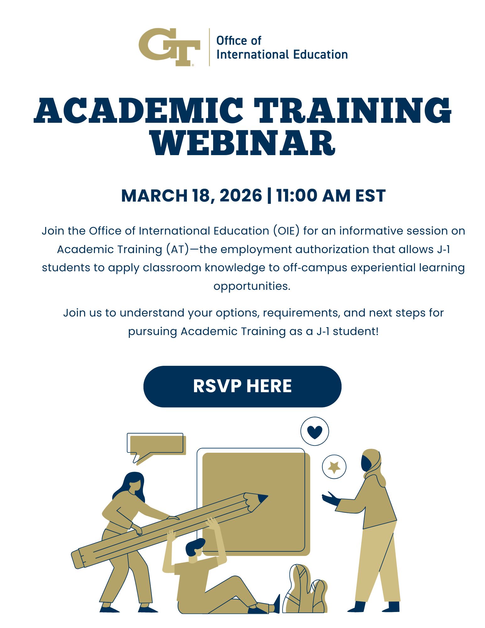 Wednesday March 18, 2026 11:00AM - 12:00PM Contact Kimberly Young - kyoung@oie.gatech.eduSarah Scott - sarah.scott@oie.gatech.eduKathleen Kirk - kathleen.kirk@oie.gatech.eduZamira Akobirova - zamira.akobirova@oie.gatech.edu Location Location Zoom J-1 Students interested in gaining knowledge on the ins and outs of how to pursue Academic Training. Related Link Registration Link Event Categories Career/Professional development Training/Workshop Invited Audiences Faculty/Staff Graduate students Undergraduate students