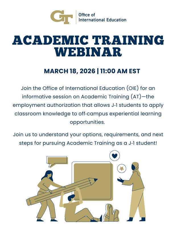 Wednesday March 18, 2026 11:00AM - 12:00PM Contact Kimberly Young - kyoung@oie.gatech.eduSarah Scott - sarah.scott@oie.gatech.eduKathleen Kirk - kathleen.kirk@oie.gatech.eduZamira Akobirova - zamira.akobirova@oie.gatech.edu Location Location Zoom J-1 Students interested in gaining knowledge on the ins and outs of how to pursue Academic Training. Related Link Registration Link
