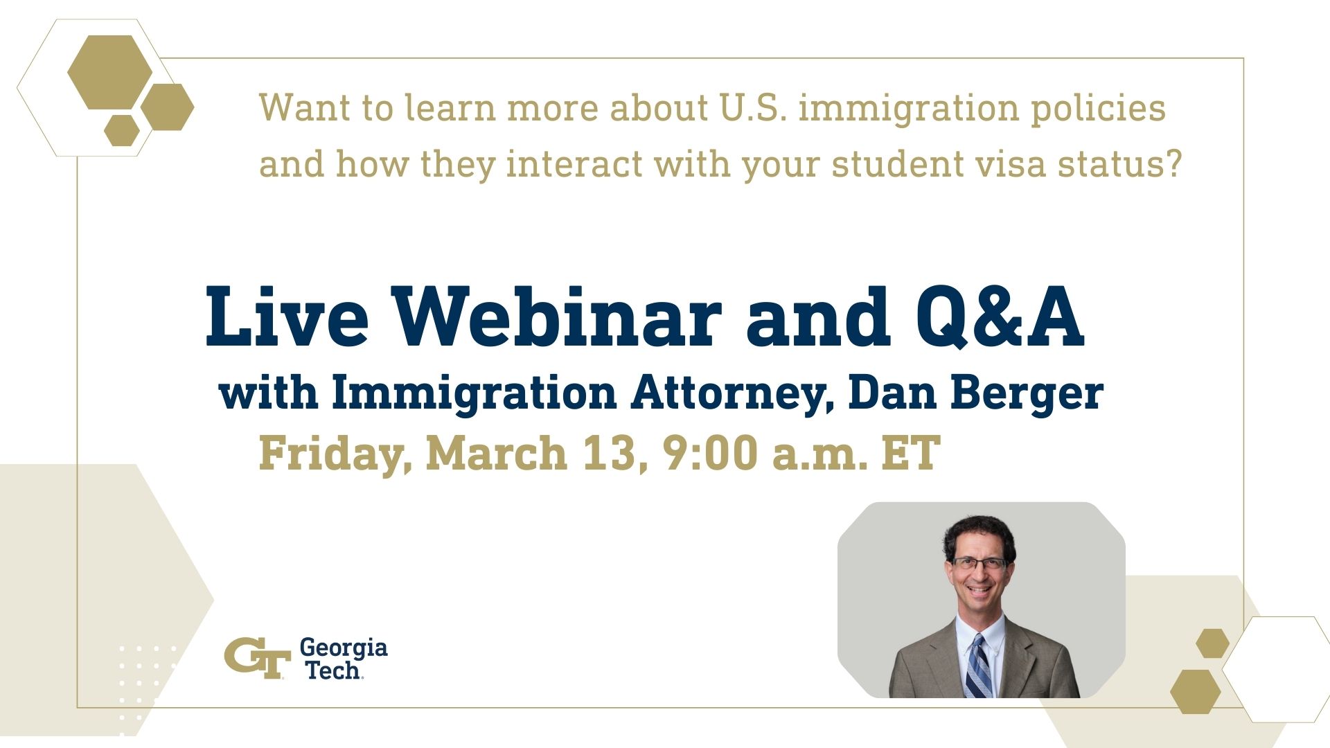 Want to learn more about U.S. immigration policies and how they interact with your student visa status? Join the Office of International Education, Belonging & Student Support, and Office of the Vice President for Student Engagement & Well-Being for a live webinar and Q&A with immigration attorney Dan Berger on March 13 at 9:00 AM ET. All students are welcome! Register here: https://gatech.zoom.us/webinar/register/WN_2pCKCmGnS42c-Uc1ga2rng